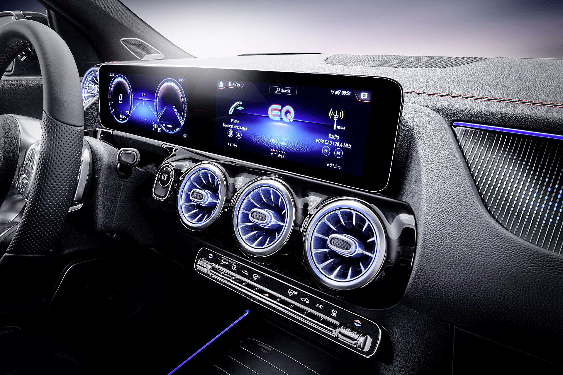 V interiéri v štýle AMG Line zaujme: multifunkčný športový volant v koži napa, dole sploštený a v oblasti držania s perforáciou. Športové sedadlá s tvarom špecifickým pre vozidlá AMG sú atraktívnym prvkom interiéru – čalúnenie z imitácie kože ARTICO/mikrovlákna DINAMICA s ozdobnými švami vo farbe stredne sivá. Aj prístrojová doska je v imitácii kože so vzhľadom kože napa, na výber je ružovozlatý alebo stredne sivý ozdobný šev. Spomeňme ešte ozdobné prvky so vzhľadom uhlíkových vlákien v antracitovej farbe, športové pedále AMG z kefovanej ušľachtilej ocele s čiernymi gumovými nopkami, podlahové rohože AM či pochrómované zaisťovacie kolíky dverí.